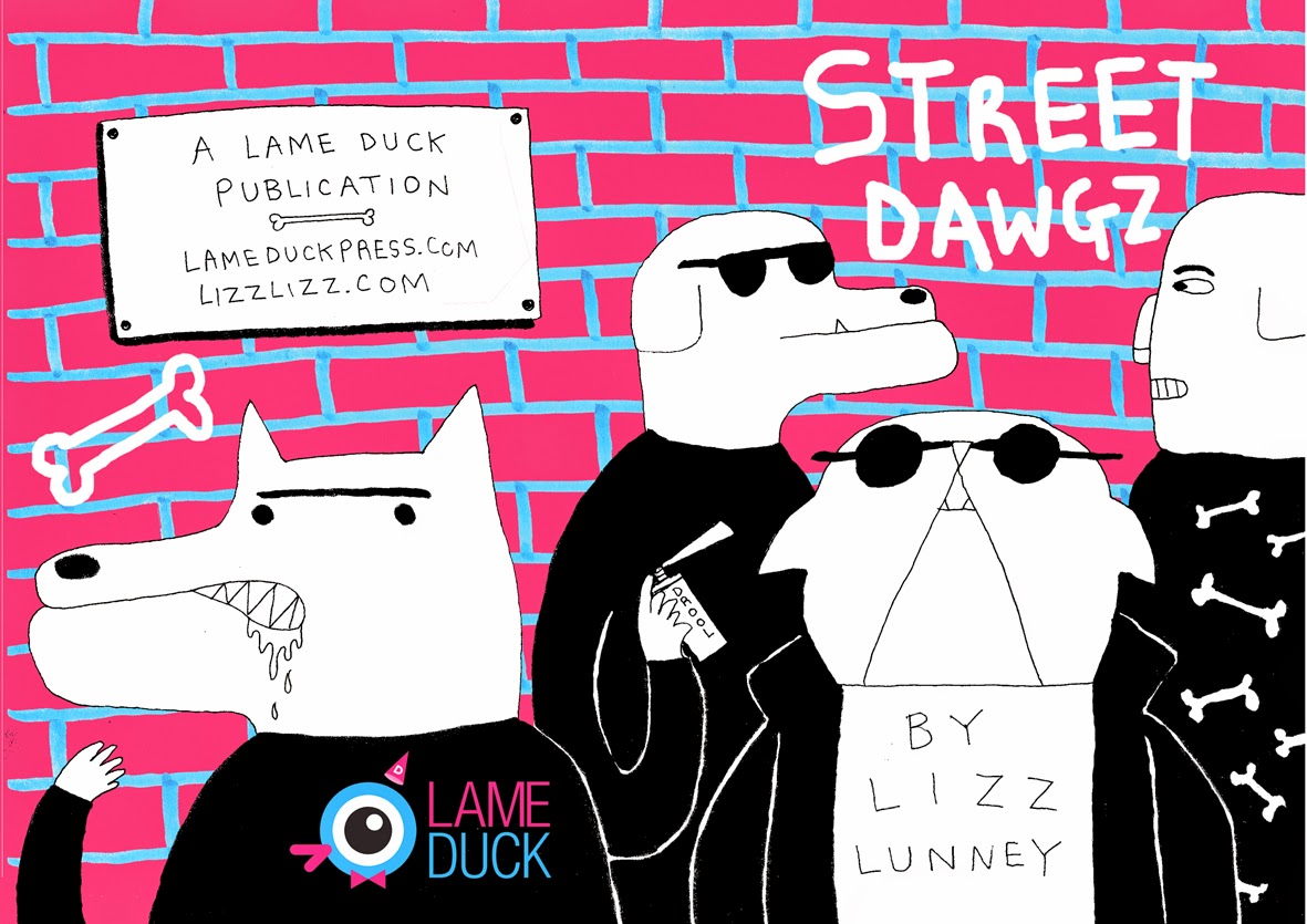 My Street Dawgz comic is an experimental comic from the new humour outfit Lame Duck. I decided to try out an idea I haven't tried before which is to draw a comic and print it as it is with no corrections and no edits. I drew the comic over the course of 5 months and it reflects the mood I was in whilst drawing it so the style becomes wilder or calmer in different parts. I would usually draw a comic in rough then redraw it neater for print but this time I wanted to retain the original rough lines in the final comic which is why it is a bit different to things I have done before. This is the cover: